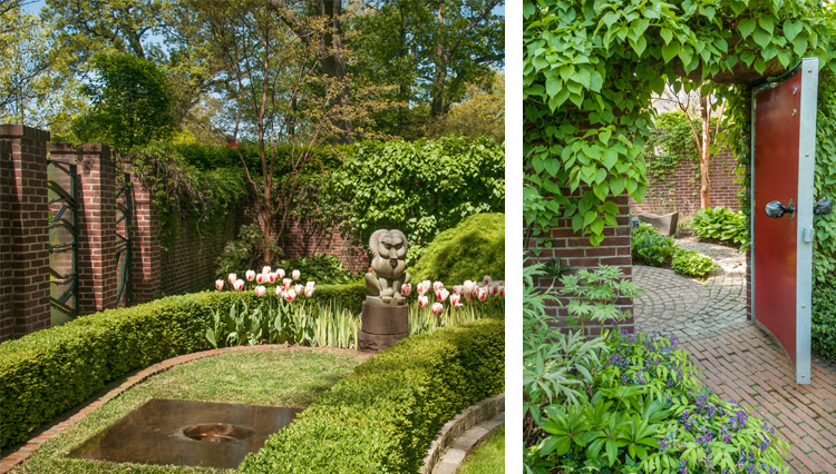 Gartentor mit Edelstahlverkleidung und aus Bronze gegossener Handgriff