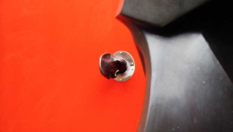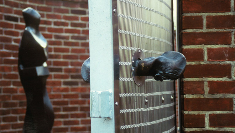 Mountsier Gate: Die leicht gebogene Kurve des Gartentors für den Mountsier Garten in New Jersey, USA wurde auf einer Seite in Zinnoberrot und auf der anderen Seite mit geflochtenem Edelstahl gefertigt. Der Handgriff wurde von der Architektin für das Projekt in Bronze gegossen. In einem Folgeauftrag wurden zwei Paneelen aus Stahl und Glas von der Architektin Sarah Riviere entworfen und gefertigt - Die Mountsier Panels.